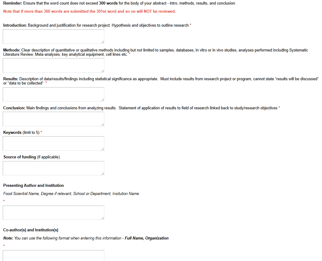 - A structured abstract submission, including Introduction, Methods, Results, Conclusion, Keywords (limit of 5)
